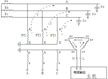 根據(jù)上圖的物理模型就可建立相應(yīng)的數(shù)學模型,通過檢測測量信號就可以測量出三相對地電容值3C0,再根據(jù)公式I=3ωC0 Uφ(Uφ為被測系統(tǒng)的相電壓)計算出配網(wǎng)系統(tǒng)的電容電流。