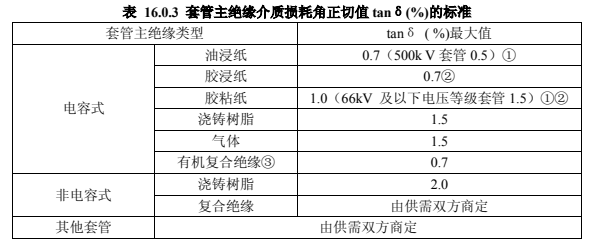 2.測量 20kV 及以上非純瓷套管的主絕緣介質(zhì)損耗角正切值 tanδ和電容值,應(yīng)符合表 16.0.3 規(guī)定: